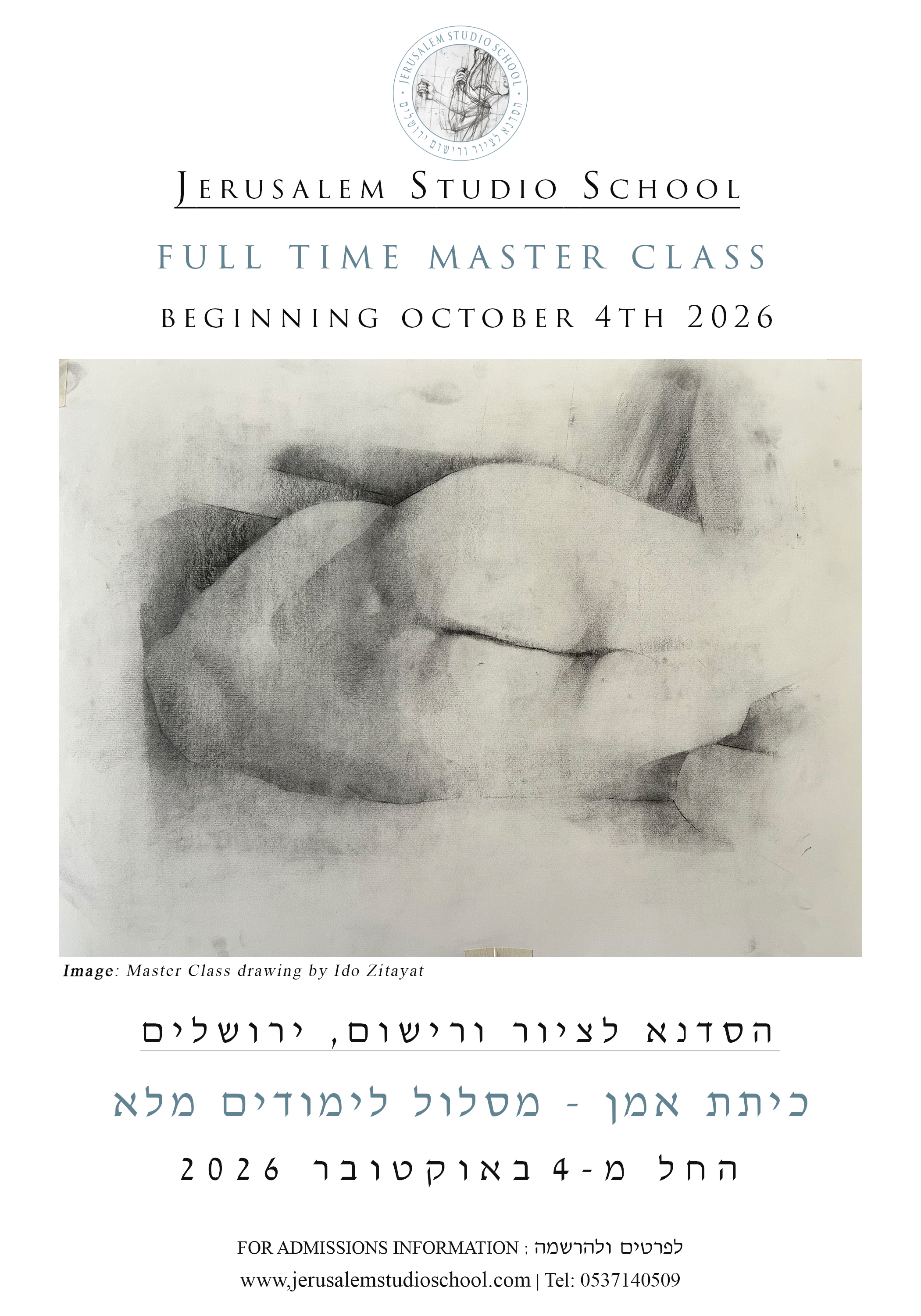 The core component of the Jerusalem Studio School is The Master Class, which provides an intensive full-time studio program for individuals of outstanding talent and motivation. The spirit of work and study in the Master Class is grounded in the creative process, through the immediacy of experience and continual practice rather than the critical process, which substitutes a cerebral/verbal encounter for what should be in the study of art a direct and unmediated act. At the JSS it is the doing that produces understanding. These guiding principles inform the student’s entire course of study at the JSS, whether it is the beginning student’s challenge to form painterly perceptions and develop a pictorial intellect, or the advanced student’s pursuit to understand intimately the formal underpinnings and essential structures in painting through pictorial research, copying and transcribing great master works. It is this concentrated and sustained physical involvement with our craft that ultimately reveals the quality and truth of one’s own voice.