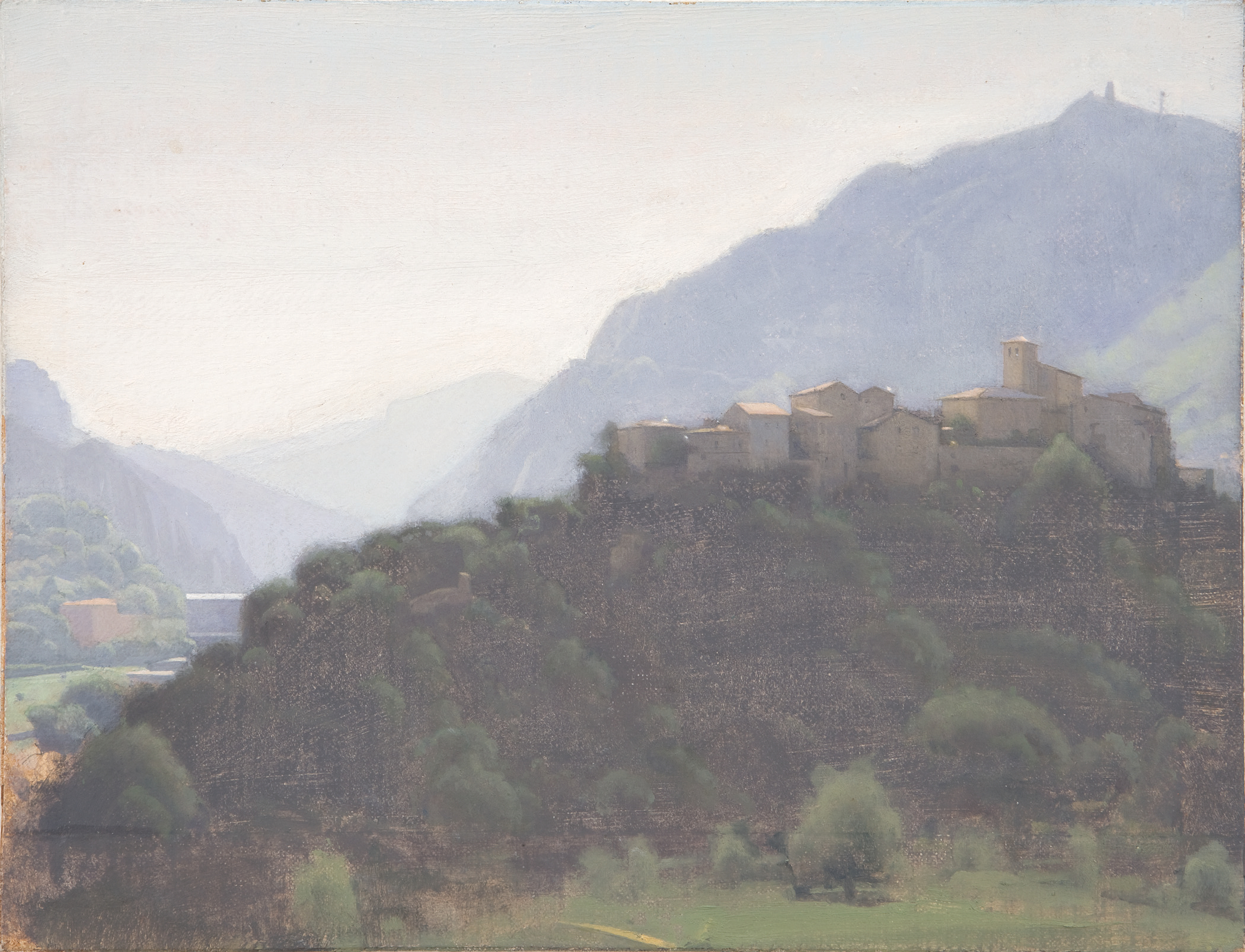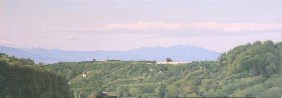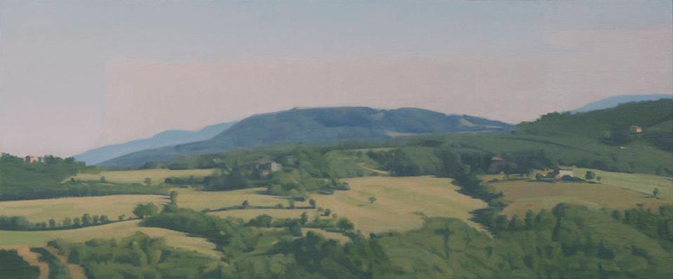 “In Montefeltro, View of Peglio,” 2011, oil on linen mounted on wood, 19 x 39.9 cm