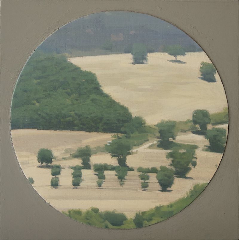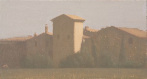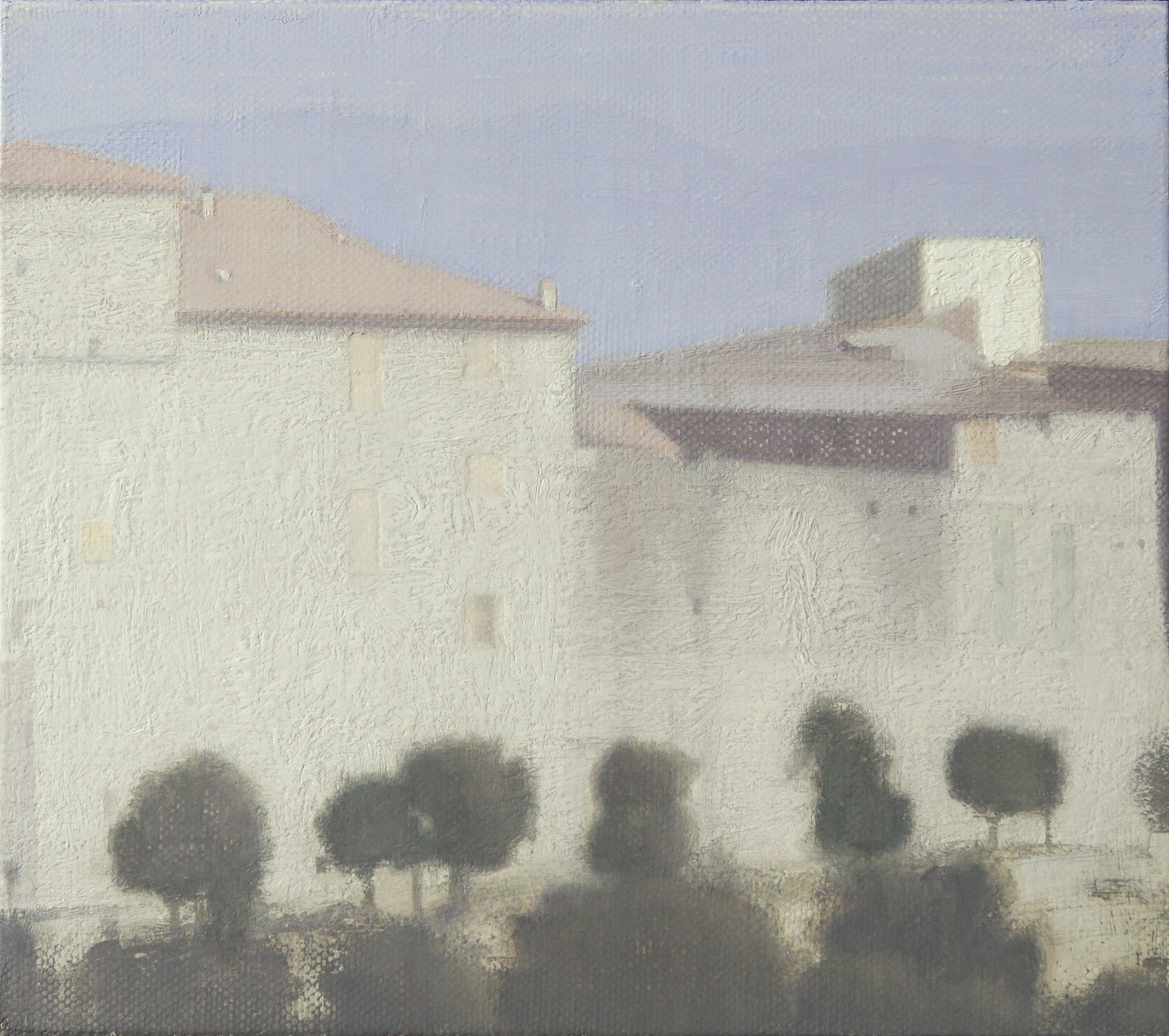 “Distant Hillside, Villa Pieve,” 2010, oil on canvas mounted on wood, 32.8 x 32.8
