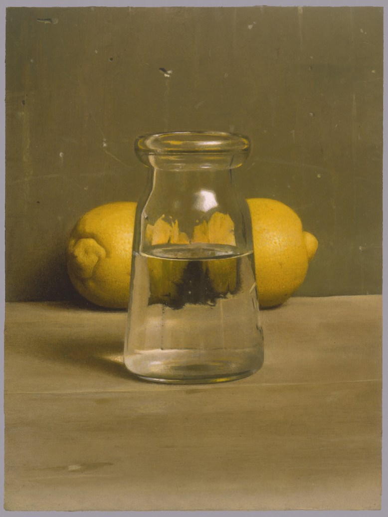 “A Flask of Water wuth Two Lemons,” 1996. Oil on canvas mounted on wood, 24 x 18 cm