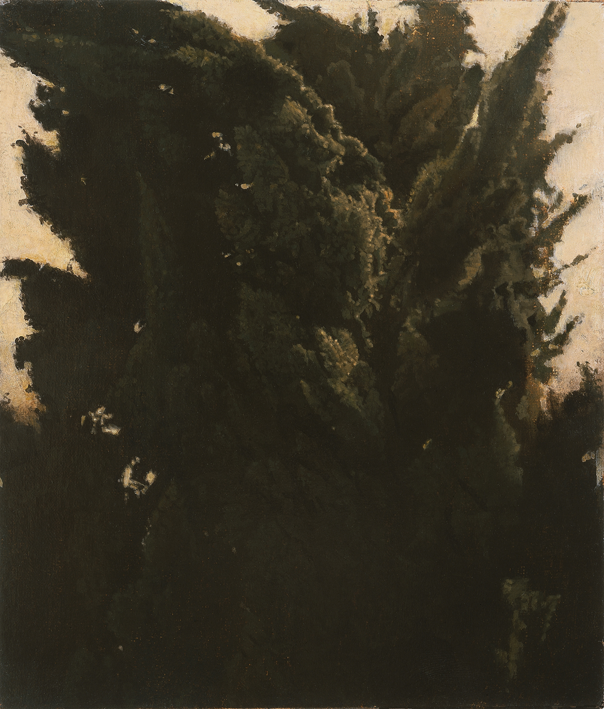 “Cypress, City’s Edge” 2000. Oil on canvas mounted on wood, 21.3 x 26.7 cm