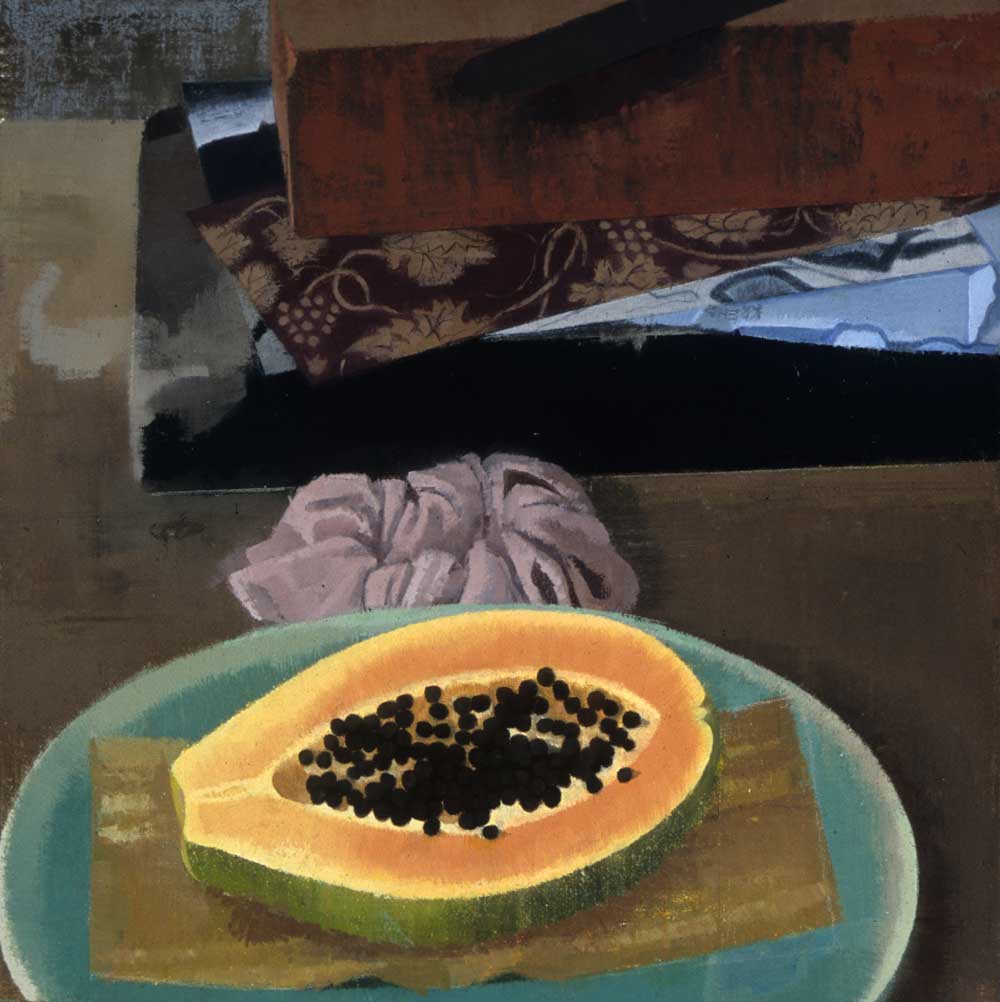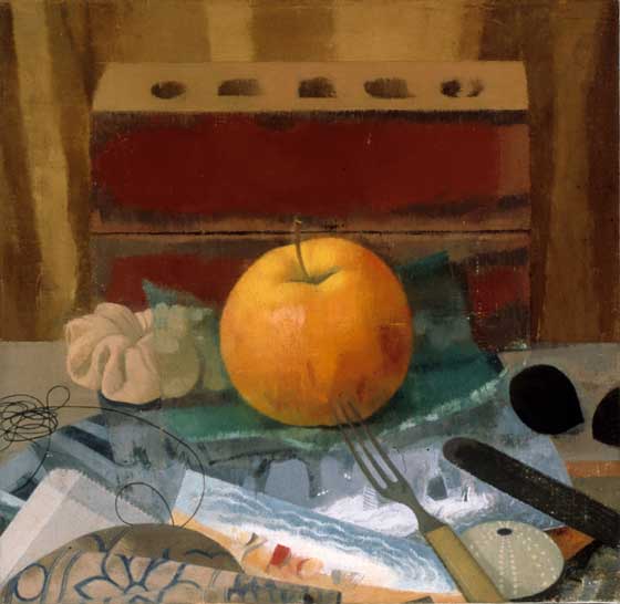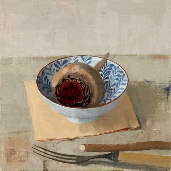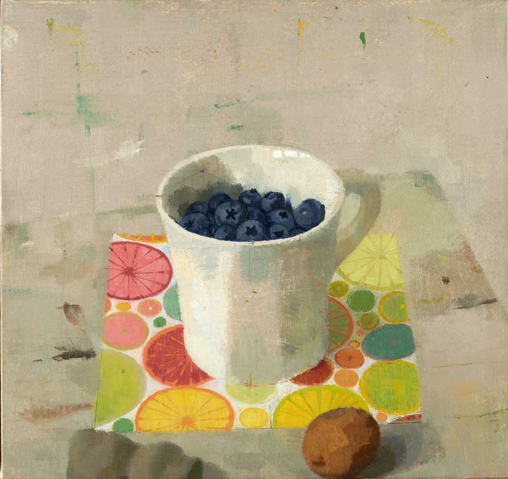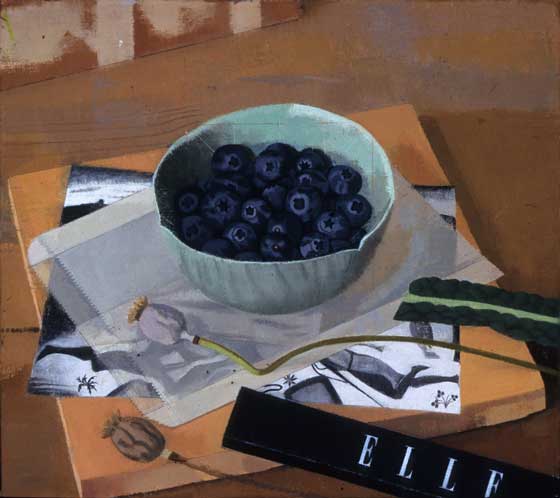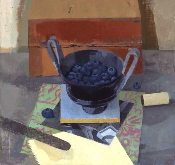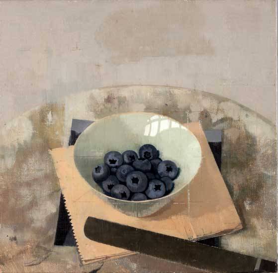 As far as the objects themselves, you are right that they are like actors in a repertory theater company. My friend the painter Ruth Miller and I have joked about auditioning fruit and vegetables in the grocery store, going through a bin of apples, setting each one apart, stepping back, evaluating, looking for the right shape, the right personality. I do have a weakness for cut open fruit—the surprise of the patterns one finds, the geometries. Blueberries are wonderful because each one has its own personality and yet the color is consistent and holds the mass together as a big dark shape. They are also surprisingly slow to rot and hold their color even when shriveled. There can be a tendency in still life for the mood to become too…benign…and then the knives and forks can be a counteracting force. I am always looking for new objects— some that I am very fond of have been sitting in my closet for years because I haven’t yet found the right role for them. Maybe this is too obvious to say; for me its always about shape and color and relationship. I don’t choose an object, at least not consciously, for any symbolic or narrative meaning.
