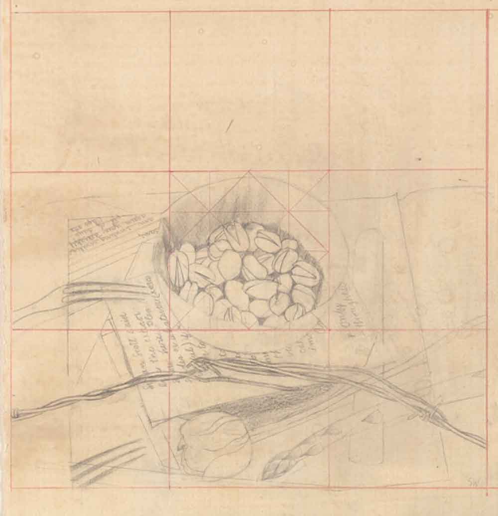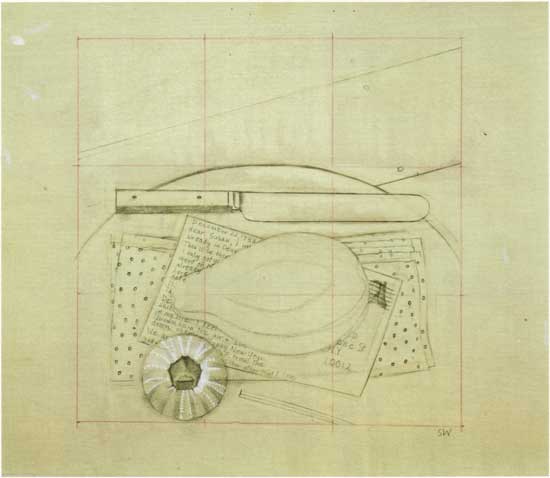 SJW: I do several different kinds of drawings, but I think you are referring to the gridded pencil drawings on toned paper, which I seem to be doing fewer of in recent years. Mostly I have done them to have a record of something in the set-up that will rot or deteriorate before I will be able to resolve the painting. I don’t ever do them first thing—it’s most often a few days into the painting. The grid is often used as a means of transferring the drawing. But I’ve also used the grid to orient myself to the vertical and horizontal. I don’t know exactly why I prefer to draw on sheets of paper that are much larger than my paintings—in painting I seem to need the confinement, in the drawings I prefer a more limitless space, but I often can feel too lost within it. It’s like the edges are too far away to comprehend—and then the grid can supply some stability.