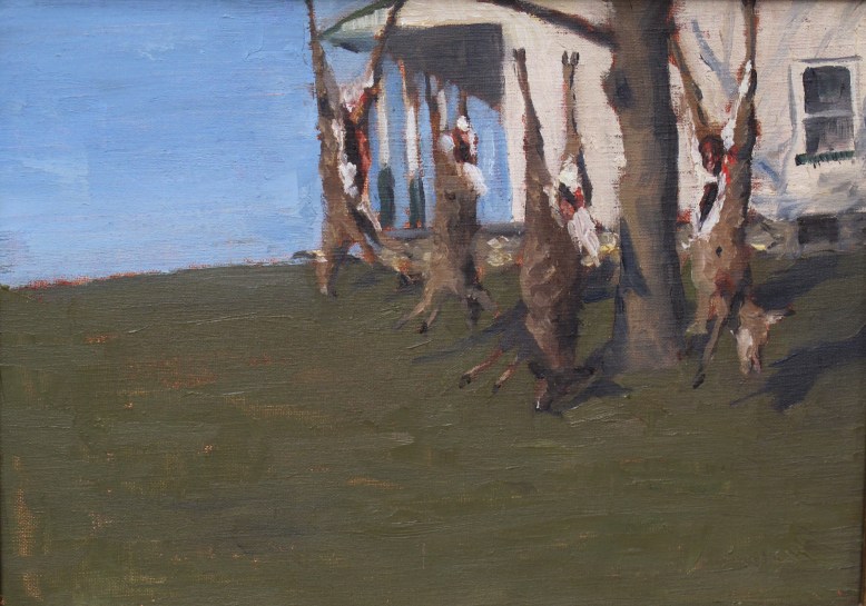 The painting Stolzfoos Doe came about one day when I was running past the Amish neighbors farm and I saw the doe hanging from his tree. I ran home, got my painting things and spent several hours painting the scene exactly as it appeared and never touched it again.