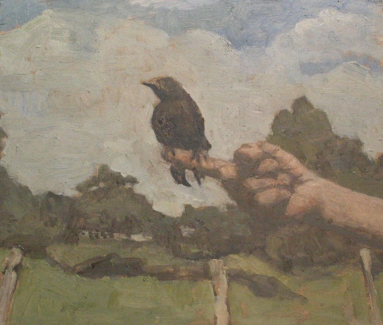 The Artist’s Hand with a Young Crow, 2008. Oil on panel, 9.5″ x 11″