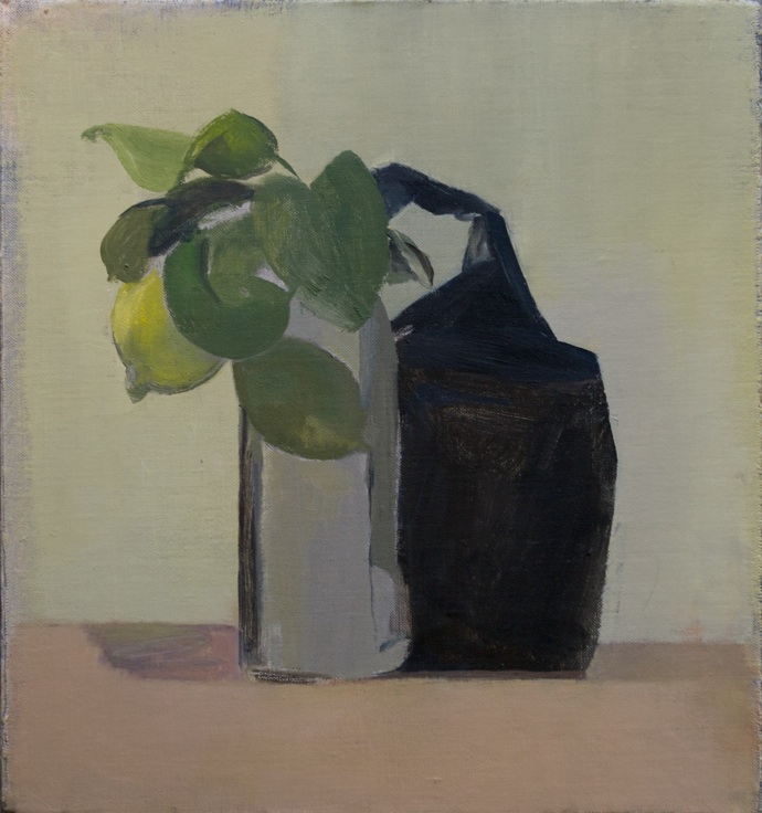 Most of my motifs are found in the places I frequent, the things I look at repeatedly. Frequent and sustained looking becomes more intelligent looking. As Stuart Shils says, “Familiarity is a good thing.” In the studio it’s more difficult, since there I have to generate the motifs by arranging things. This can be the hardest part of still life painting. It’s not only a problem of creating a composition, the objects have to speak to each other in a way that makes sense. Occasionally, I’ll be surprised by seeing something around the house or in my studio, a motif that has just fallen together accidentally like the coffee bag with the lemon that I painted.