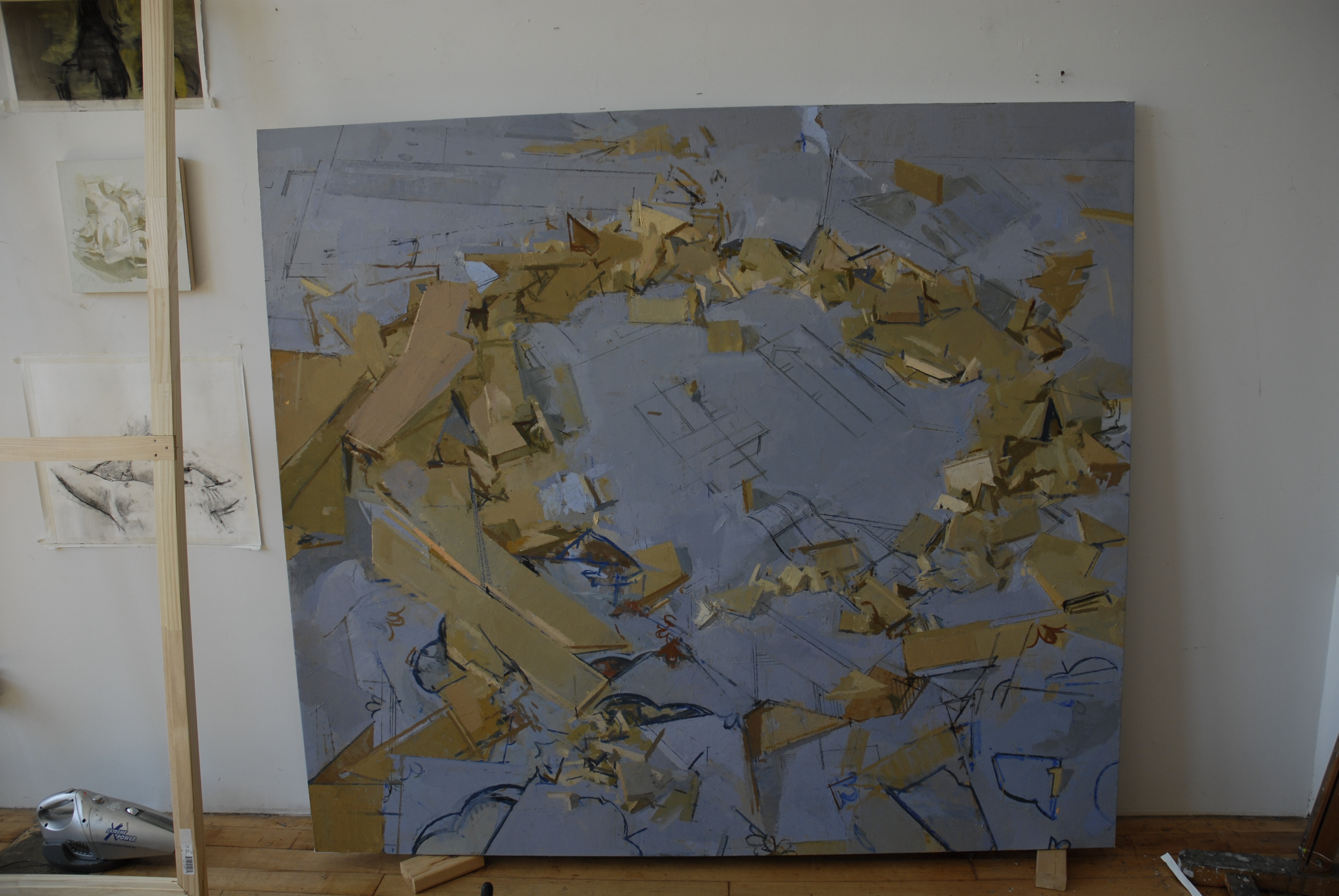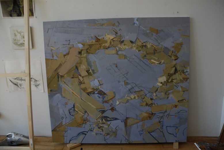 SM) These last few months have been nice in terms of having uninterrupted studio time. After the shows in December, my studio has been cleared, and thankfully nothing is coming back! I have a fairly open schedule with no upcoming shows, and this hasn’t happened in quite a while. So, after a long time I feel like I can experiment and try to explore my divergent ideas without worrying about cohesiveness, or how they relate! This is sometimes frustrating, because it seems I have 3-4 threads going simultaneously without any rhyme or reason. In many ways it feels like going back to square one. Some nights I literally paint and un-paint multiple ‘starts’ of paintings on the single canvas, and as I was mentioning to a friend recently, it seems I am eliminating paintings that I don’t want to do through this process. My goal over the next few months is to keep going with this. I just stretched a big canvas yesterday, and I am hoping to get it moving before I have to leave the studio in August.