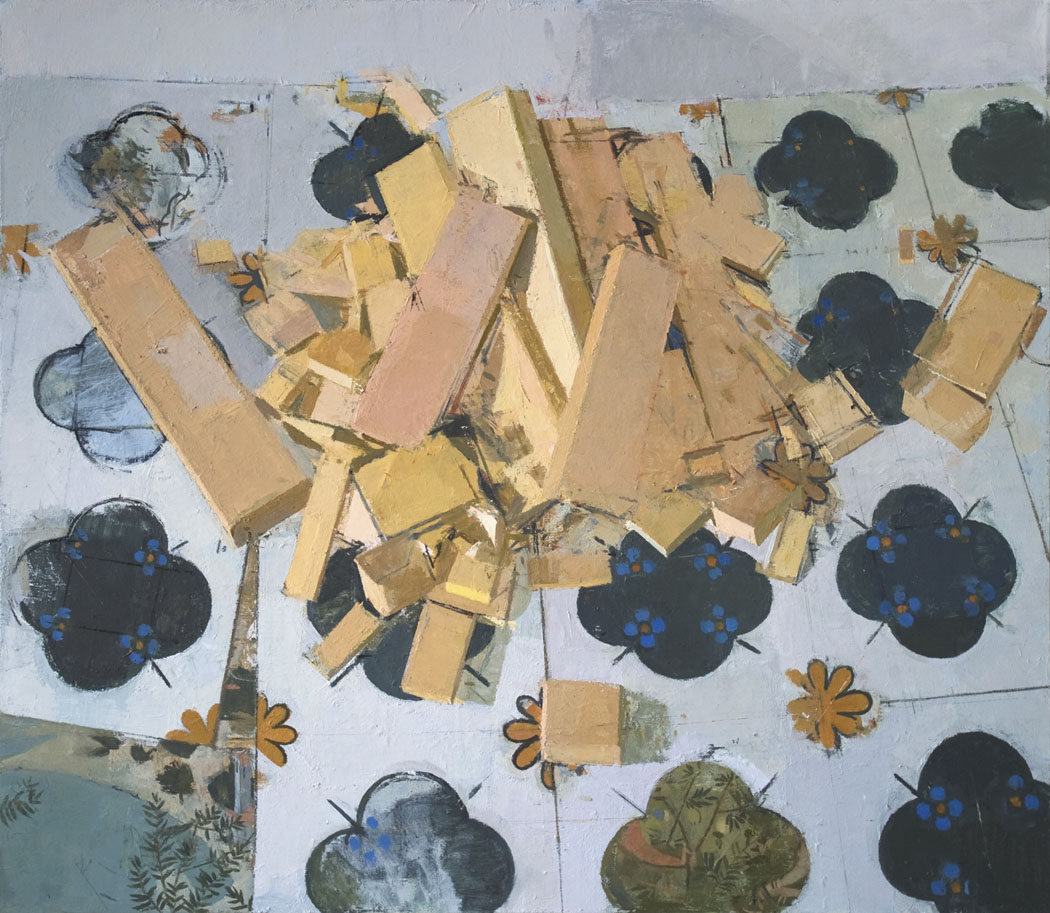So, ‘Islands’ was a building ‘up’ as opposed to breaking through. But I noticed that the built form looked more like a ‘burial’ of sorts and I can’t help think about what’s underneath. The hand-made tiles, which I had used in earlier paintings were also a simple marker of something earthly and organic. All the tiles were fairly uniform and I decided at the very end to disturb the symmetry, suggesting another level of space. But the decision was in some ways to break the sense of real, of gravity, that comes from a certain type of naturalism.